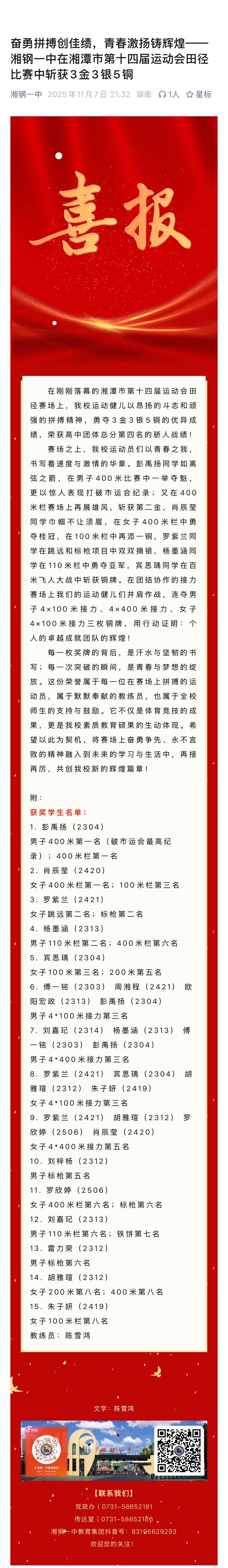 喜報(bào):湘鋼一中在湘潭市第十四屆運(yùn)動(dòng)會(huì)田徑比賽中斬獲3金3銀5銅